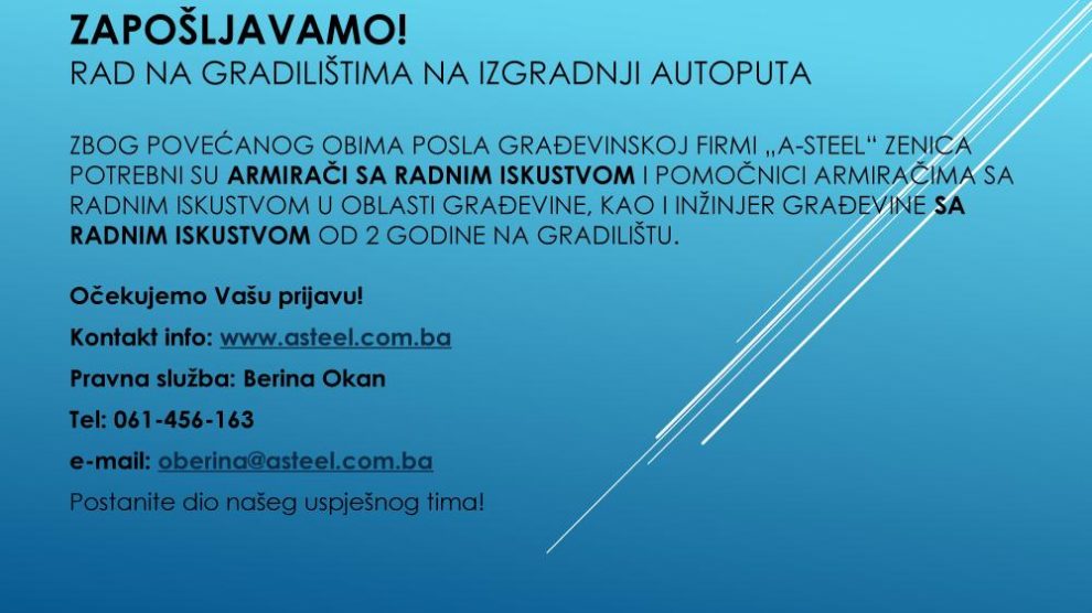 Zapošljavamo! Zbog povećanog obima posla građevinskoj firmi “A-Steel” Zenica potrebni su ARMIRAČI SA RADNIM ISKUSTVOM i pomoćnici armiračima sa radnim iskustvom u oblasti građevine, kao i inžinjer građevine sa radnim iskustvom na gradilištu od 2 godine. Postanite dio našeg...