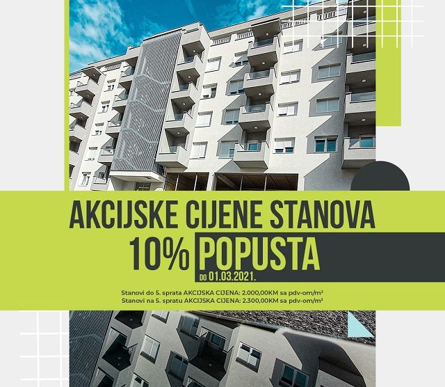 Novogradnja, stambeno poslovni objekat Residence u naselju Crkvice u Zenici trenutno nudi akcijske cijene i mogućnost uštede i do 10% u odnosu na redovnu cijenu! Akcija traje do 01.03.2021. Residence nudi izbor jednosobnih i dvosobnih stanova. Jednosobni stanovi od 42,29 m2 sa dnevnim...
