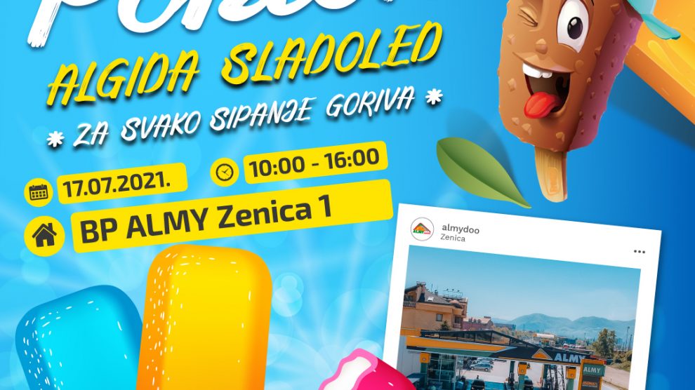 ALMY: Gratis ALGIDA sladoled- Cijenjeni kupci kompanije Almy, spremili smo iznenađenje za Vas. Sve kupce naftnih derivata na benzinskoj pumpi Almy Zenica 1, u subotu 17.07.2021 u periodu od 10:00 do 16:00h, obradovat ćemo sa ALGIDA sladoledom.