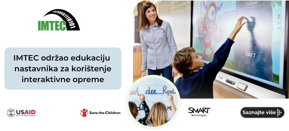PROJEKAT TABLA: IMTEC održao edukaciju nastavnika za korištenje interaktivne opreme- U sklopu Projekta opšteg obrazovanja (TABLA) koji finansira Američka agencija za međunarodni razvoj (USAID), a provodi organizacija Save the Children, kompanija IMTEC je izvršila edukaciju nastavnika za...