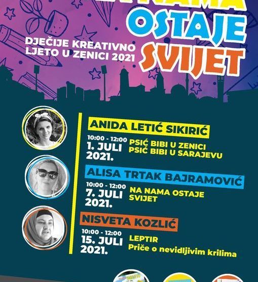 Zeničko kulturno kreativno ljeto: “Na nama ostaje svijet”- Četvrtak, 15. juli 2021. godine 10.00 – 12.000 sati Prostor ispred knjižare EN (Titova 22, Zenica) NA NAMA OSTAJE SVIJET Učestvuje: Nisveta Kozlić, odgajateljica i kreativka, autorica slikovnica od platna Gosti:...