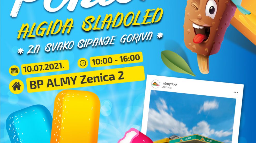 ALMY: Gratis ALGIDA sladoled- Cijenjeni kupci kompanije Almy, spremili smo iznenađenje za Vas. Sve kupce naftnih derivata na benzinskoj pumpi Almy Zenica 2, u subotu 10.07.2021 u periodu od 10:00 do 16:00h, obradovat ćemo sa ALGIDA sladoledom.