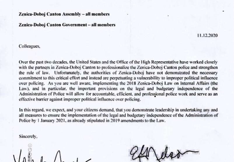 Ambasada Sjedinjenih Američkih Država (SAD) u Bosni i Hercegovini (BiH) i Ured visokog predstavnika (OHR) žestoko su kritikovali vlasti Zeničko-dobojskog kantona zbog novog prolongiranja primjene Zakona o unutrašnjim poslovima u tom kantonu. U zajedničkom pismu koje je u posjedu portala...