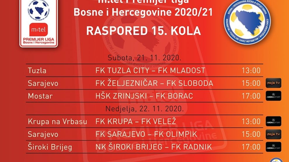 Predstojećeg vikenda na rasporedu petnaesto kolo m:tel Premijer bh. lige u nogometu – Nakon reprezentativne pauze, 15.kolom nastavlja se m:tel Premijer bh.liga u nogometu. Petnaesto kolo bit će odigrano u subotu i nedjelju, 21. i 22.11.2020.godine, a na rasporedu je šest utakmica...