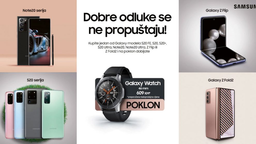 Uz svaki kupljeni Galaxy model S20, Note20, Z Flip, na poklon dobijate Samsung galaxy watch 46 mm. – Nikada nije bilo bolje vrijeme odlučiti se za kupovinu jednog od fenomenalnih Samsung telefona. Ako se odlučite za kupovinu S20 FE, S20, S20+, S20 Ultra, Note20, Note20 Ultra, Z Flip...
