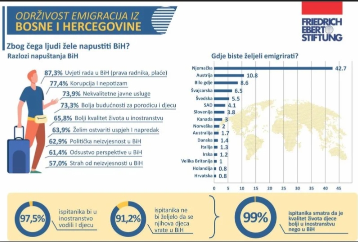 Najveći broj građana BiH želi iseliti zbog uslova rada, Njemačka za većinu prvi izbor – Njemačka Fondacija Friedrich Ebert je objavila publikaciju “Održivost emigracija iz Bosne i Hercegovine”, koja između ostalog sadrži podatke o razlozima iseljavanja stanovništva i u...
