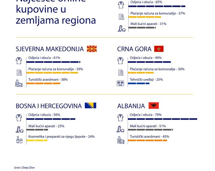 Internet: 56 posto građana BiH kupuje preko interneta – Oko 56 posto korisnika platnih kartica u Bosni i Hercegovini nabavlja robu i usluge putem interneta. Od toga, 29 posto potrošača obavlja online kupovinu par puta mjesečno, više od polovine to čini par puta godišnje, dok pet...