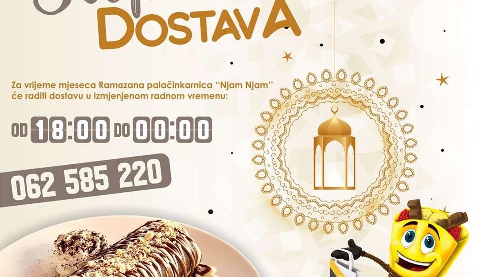 Palačinkarnica “Njam Njam”: dostava i šalterska prodaja za vrijeme Ramazana – 🚨 OBAVJEŠTENJE 🚨 Za vrijeme mjeseca Ramazana palačinkarnica “Njam Njam” će vršiti dostavu i šaltersku prodaju u izmjenjenom radnom vremenu! ▪️ ⏰ od 18:00 do...
