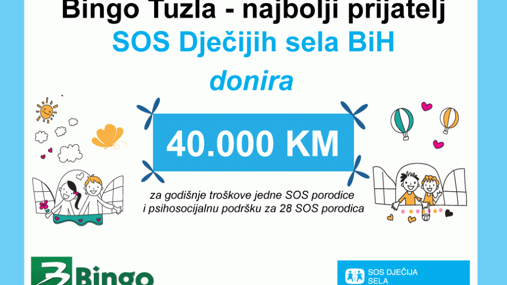 Kompanija Bingo sedmu godinu podržava SOS Dječija sela BiH – donirana zaštitna oprema i 40.000 KM – Potpisivanjem ugovora o donaciji između Edina Ibrahimovića, izvršnog direktora za biznis operacije kompanije Bingo i Mirele Gruenther-Đečević, nacionalne direktorice SOS...