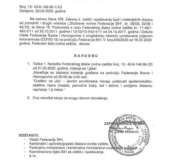 Današnjom novom izmijenjenom naredbom tačka 1. naredbe Federalnog štaba civilne zaštite (FŠCZ) od 21. marta po kojoj je zabrana kretanja građana na području Federacije Bosne i Hercegovine (FBiH) trajala od 18 do 5 sati se mijenja i novom naređuje zabrana kretanja građana na području...