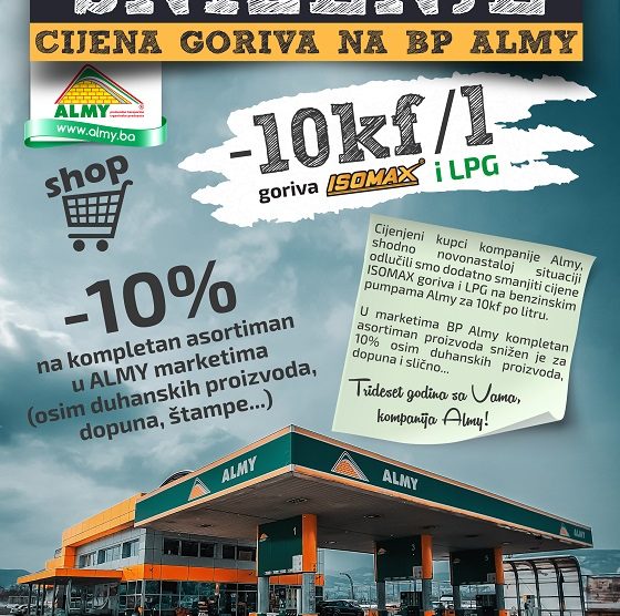 Almy: dodatno sniženje na benzinskim pumpama – “Cijenjeni kupci kompanije Almy, shodno novonastaloj situaciji odlučili smo dodatno smanjiti cijene ISOMAX goriva i LPG-a na benzinskim pumpama Almy za 10kf po litru. U marketima BP Almy kompletan asortiman proizvoda snižen je za...