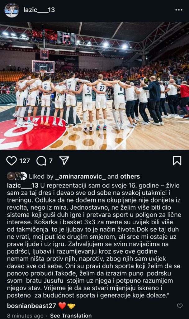 “U reprezentaciji sam od svoje 16. godine – živio sam za taj dres i davao sve od sebe na svakoj utakmici i treningu. Odluka da ne dođem na okupljanje nije donijeta iz revolta nego iz mira. Jednostavno ne želim više biti dio sistema koji guši duh igre i pretvara sport u poligon za lične interese. Košarka i basket 3×3 za mene su uvijek bili više od takmičenja, to je ljubav, to je način života. Dok se taj duh ne vrati, moj put ide drugim smjerom, ali srce mi ostaje uz prave ljude i uz igru”, napisao je Lazić na društvenim mrežama i dodao: