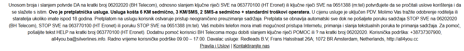 Ipak, na dnu stranice sitnim slovima je napisano da unošenje broja i potvrda unošenja znače pristanak na pretplatničku uslugu koja košta 6 KM sedmično, plus standardni troškovi operatera. U ovom objašnjenju je također sitnim slovima napisano i kako otkazati pretplatu.