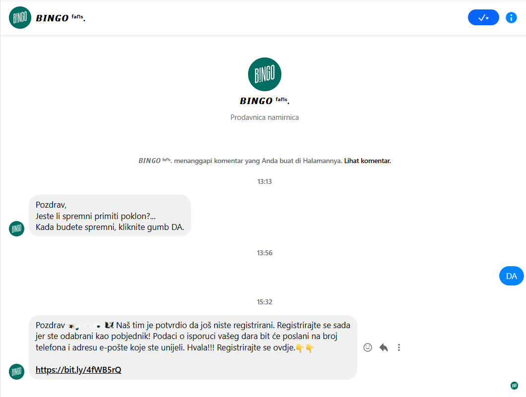 Ostavili smo komentar ispod objave “nagradne igre” na stranici BINGO fans. Ubrzo nakon toga dobili smo poruku od stranice. U poruci je napisano da smo odabrani kao pobjednik i da je potrebno izvršiti registraciju na linku koji je poslan.