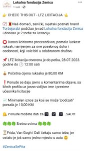 Licitirati za ruksak branda Torbejarabi može se samo na Facebook stranici Lokalne fondacije Zenica. LFZ licitacija je otvorena do petka, 28.07.2023. godine do 12:00 sati. Početna cijena ruksaka je 80,00 KM. Ponude se daju javno u komentarima objave, sa ličnih profila uz jasno vidljivo ime i prezime učesnika licitacije. Minimalan iznos za koji se može “podizati” ponuda je 10,00 KM. Novac prikupljen licitacijom biće uplaćen u Fond za podršku lokalnim idejama i inicijativama na sljedećem javnom konkursu.