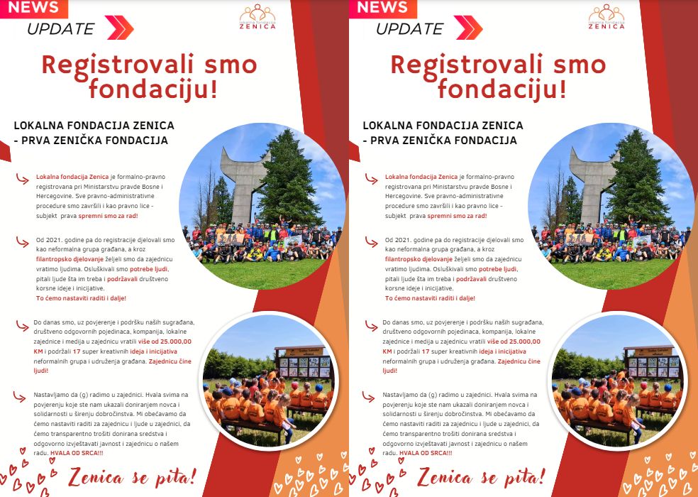 Lokalna fondacija Zenica formalno-pravno je registrovana pri Ministarstvu pravde Bosne i Hercegovine dana 12.04.2024. godine. Sve administrativne procedure neophodne za poslovanje su okončane i prva zenička fondacija zvanično može da krene sa radom.