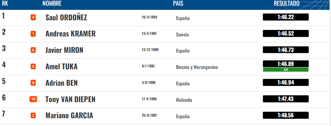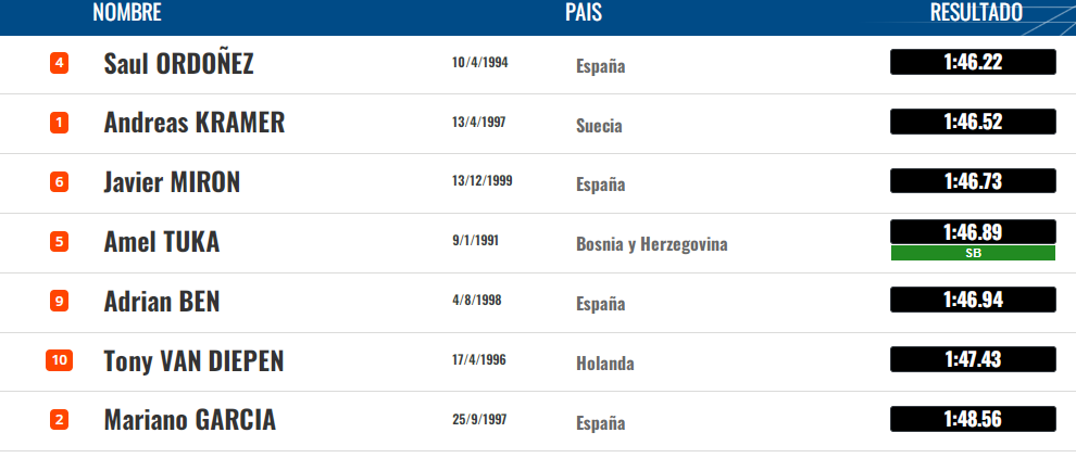 Konkurenti su mu bili Šveđanin Andreas Kramer, koji je s 1:46,52 bio drugi te Španjolci Adrian Ben, Javier Miron, Mariano Garcia i Saul Ordonz te Nizozemac Tony Van Diepen. Treći je bio Španjolac Miron s 1:46,73.