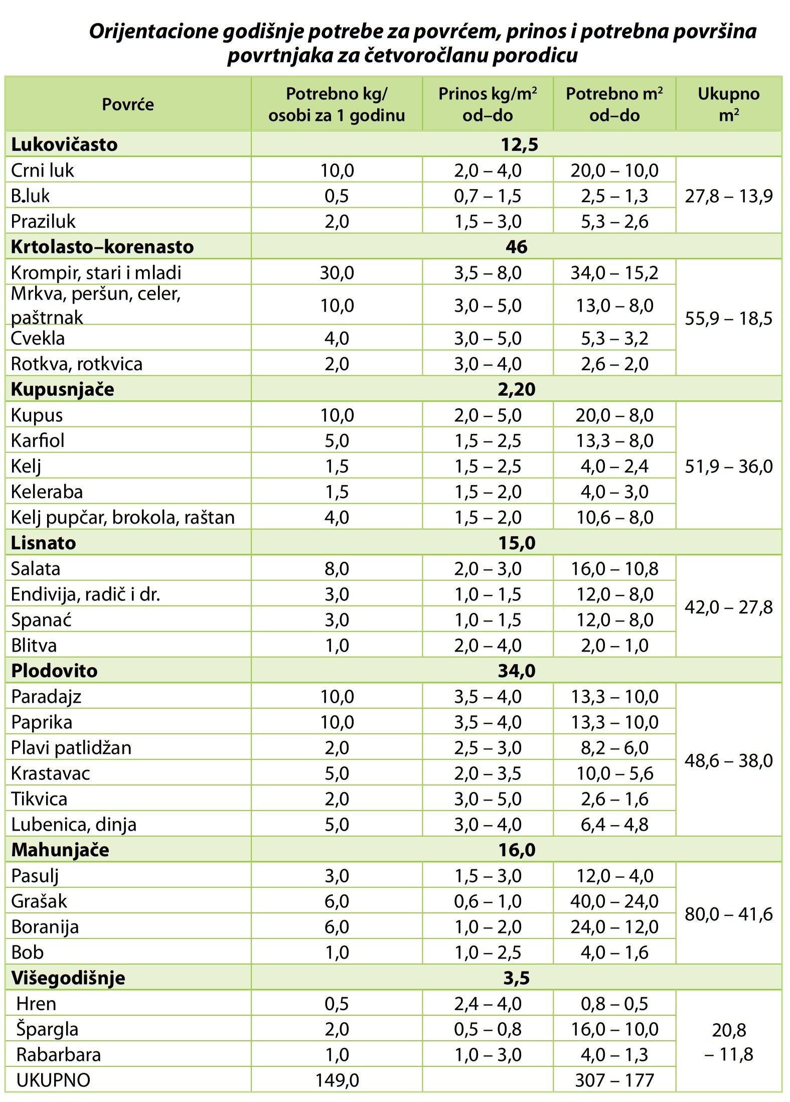 U tabeli “Bašta zelena cijele godine” koju je kreirala dr. Branka Lazić, daje se pregled potreba prosječne četveročlane porodice u osnovnim povrtlarskim proizvodima. Ono što je najvažnije ovakve male bašte i proizvodi koji se dobiju na njima u potpunosti se mogu uzgojiti u skladu sa principima integralne i ekološke proizvodnje, bez upotrebe vještačkih đubriva i pesticida, jer na ovako malim površinama veoma jednostavno je kontrolisati korove, biljne bolesti i štetočine.