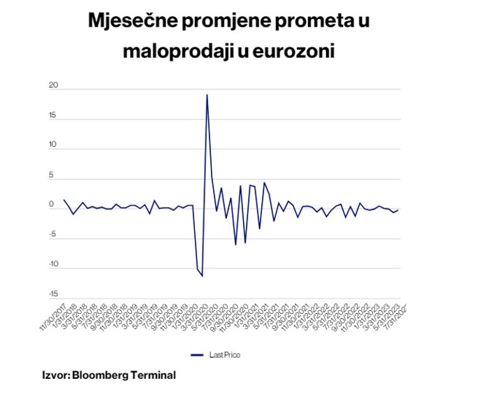 Gledano po pojedinim kategorijama maloprodaje, u septembru je u eurozoni na mjesečnom nivou prodaja neprehrambenih proizvoda bila 1,9 posto niža, a kod goriva za 0,9 posto.