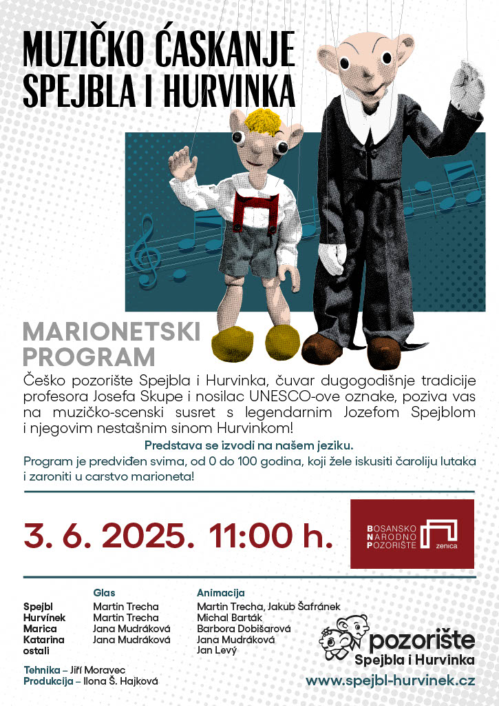 Najpoznatije češke marionete Spejbl i Hurvinka gostuju na sceni Bosanskog narodnog pozorišta Zenica, i to sa marionetskim programom „Muzičko ćaskanje sa Spejblom i Hurvinkom”. Predstava je na repertoaru u utorak, 3. juna sa početkom u 11 sati. Lutkarsko pozorište iz Praga publici u Zenici donosi jednu od svojih najboljih predstava za djecu i odrasle.