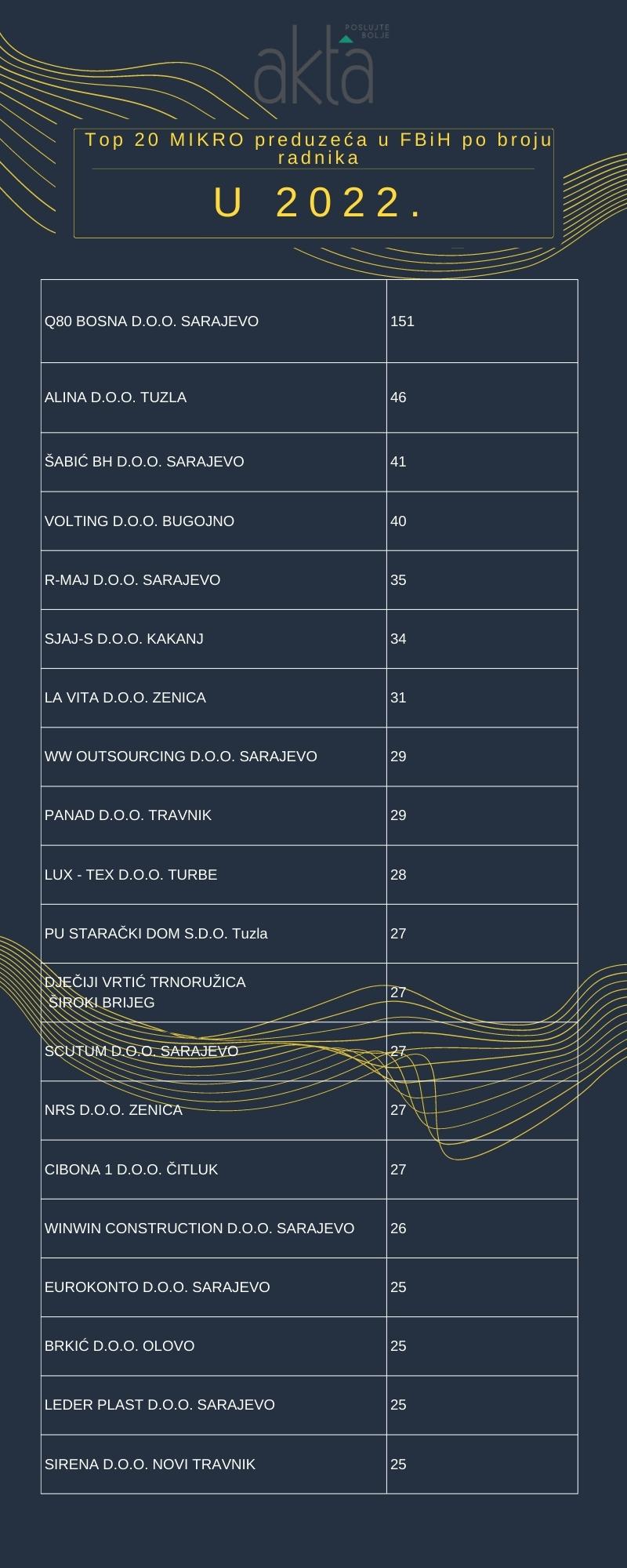 Prema podacima koje je objavila Finansijsko-informatička agencija (FIA) portal Akta.ba je spremio analizu TOP 20 MIKRO preduzeća  u Federaciji Bosne i Hercegovine po broju radnika u 2022. godinu.