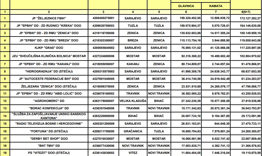 U vrhu kompanija i ustanova koje duguju za poreze, doprinose, takse i druge naknade u Federaciji nalaze se Željeznice FBiH koje duguju 172,1 milion KM, Rudnik mrkog uglja Kreka 164,1 milion KM, RMU Zenica 150,1 milion KM, RMU Breza 119 miliona KM. Zatim Kantonalno javno komunalno preduzeće GRAS 117,2 miliona KM, Sveučilišna klinička bolnica Mostar 102,8 miliona KM…