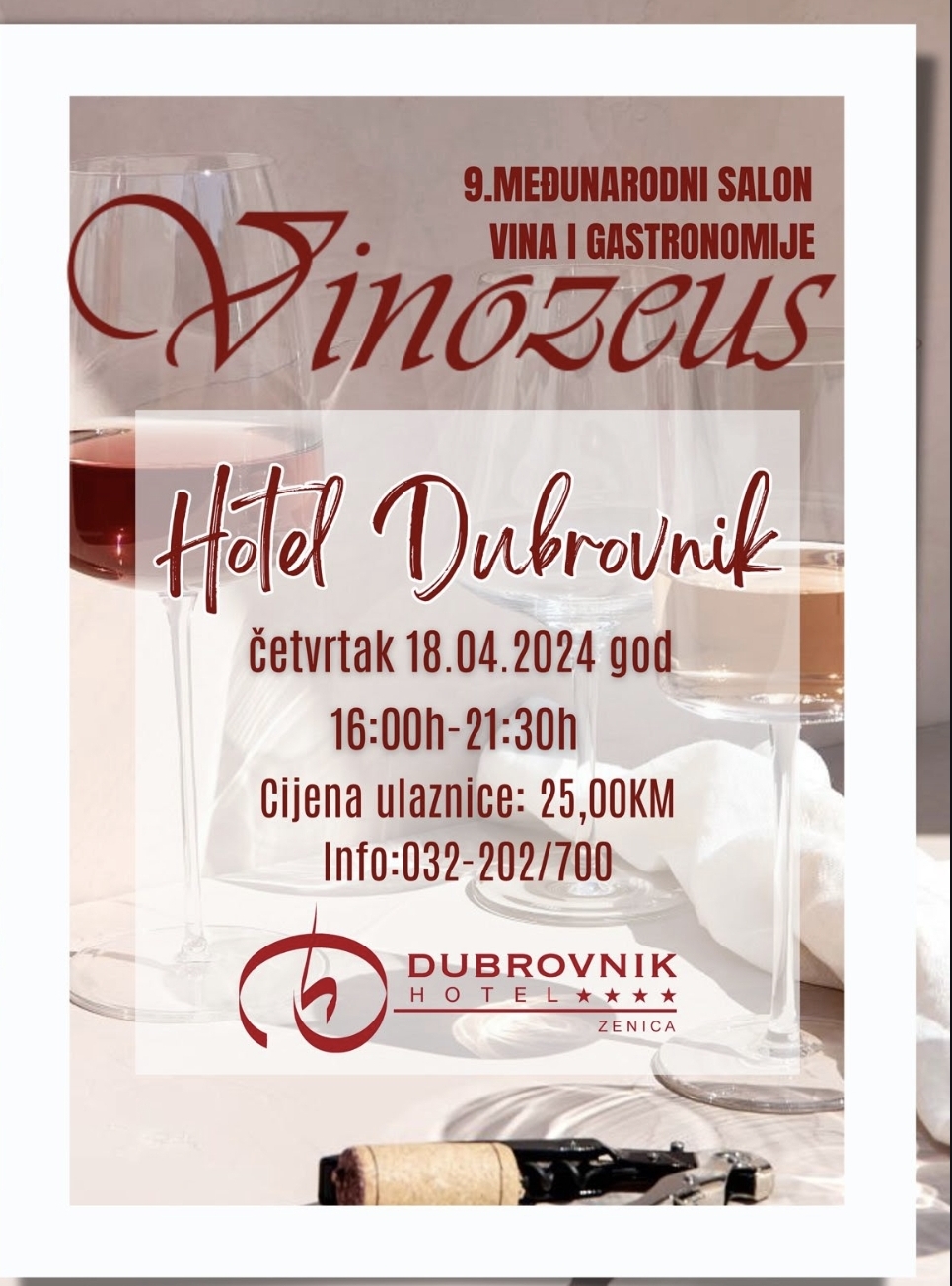 DUBROVNIK d.o.o. Zenica, organizuje 9. Međunarodni salon vina„VINOZEUS“, koji će se održati u hotelu Dubrovnik, 18. aprila 2024. godine (četvrtak od 16:00-21:30 h) .