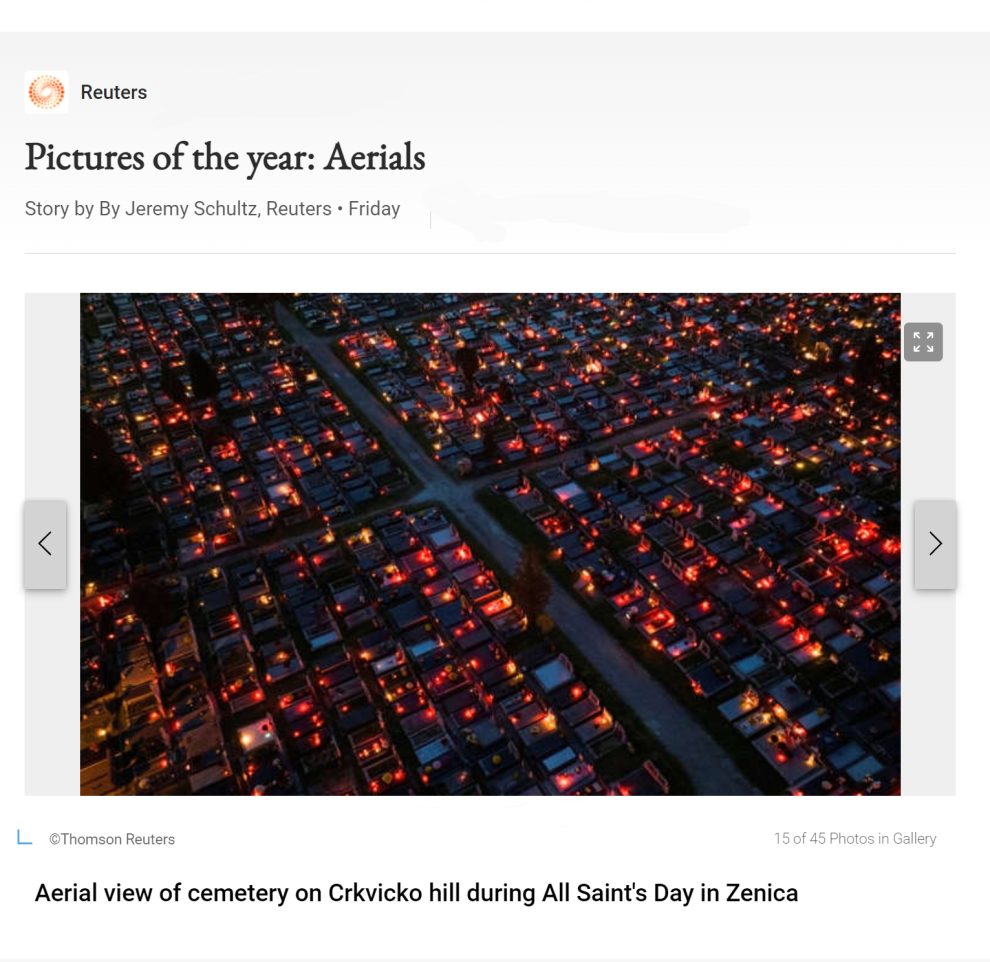 – Posebno mi je drago jer se ove godine našla fotografija iz mog grada i to u izboru od nekoliko miliona fotografija koje tokom godine novinska agencija Reuters objavi. Fotografija je nastala tokom obilježavanja blagdana “Svi Sveti”, a nastala je na Gradskom groblju Crkvice. Već nekoliko godina koristim dron kako bi napravio fotografiju iz tog “posebnog” ugla, a koji građani nemaju priliku vidjeti. Svake godine u objavama u velikom broju svjetskih medija budu baš fotografije iz Zenice, a posebno mi je drago da je ove godine moja fotografija izabrana u najužem krugu fotografija koje su obilježile godinu, rekao je Ruvić za Zenicablog.