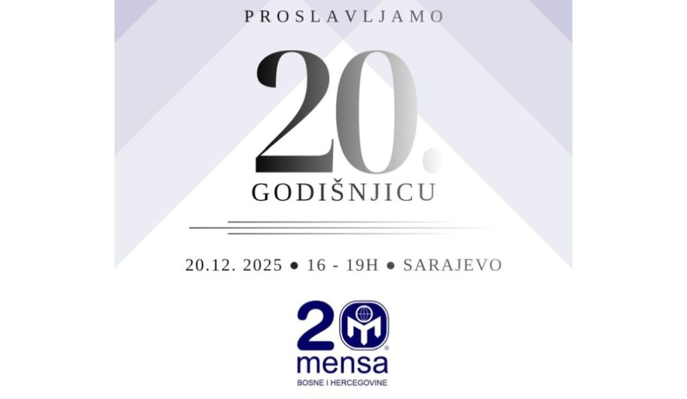 Dvadeset godina postojanja Mense BiH obilježava se nizom aktivnosti, uključujući svečani banket i promociju rada organizacije u subotu 20.12.2025. godine u hotelu Courtyard by Marriott, od 16:00 do 19:00 sati, uz obraćanje osnivača i video obraćanje Direktorice Mense International, učešće predstavnika iz regije i još mnogo iznenađenja. Ovaj jubilej je prilika da se istakne značaj Mense BiH u afirmaciji znanja, darovitosti i intelektualnog potencijala građana Bosne i Hercegovine.