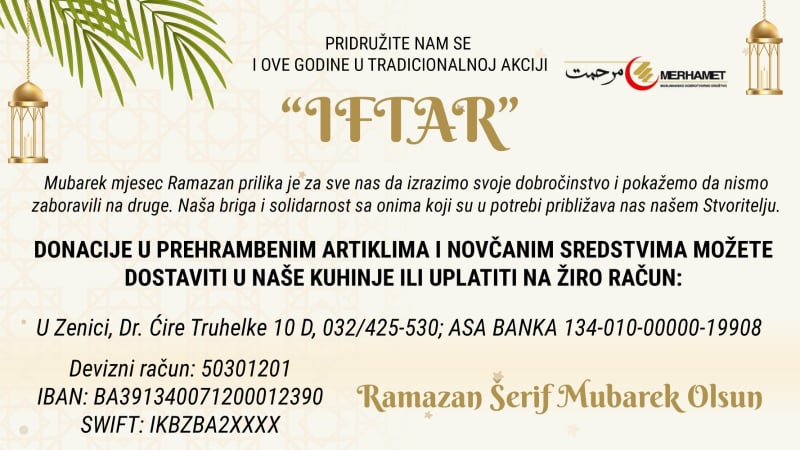 Muslimansko dobrotvorno društvo “Merhamet” Regionalni odbor Zenica, tradicionalno, i ove godine organizuje akciju “IFTAR”. Želimo da zajednički učestvujemo u ovoj akciji, te da radost iftara osjete oni koji su u stanju socijalne potrebe. Akcija se sastoji od pripreme i podjele iftara u Merhametovim prostorijama, podjele iftara na terenu i podjele prehrambenih paketa. Mubarek mjesec Ramazan prilika je za sve nas da ne zatvaramo oči pred potrebama siromašnih. Stoga Vas molimo da zajednički iskažemo solidarnost i suosjećajnost, te da zajedničkim snagama pomognemo onima kojima je naša pomoć potrebna da isposte Mubarek Ramazan.