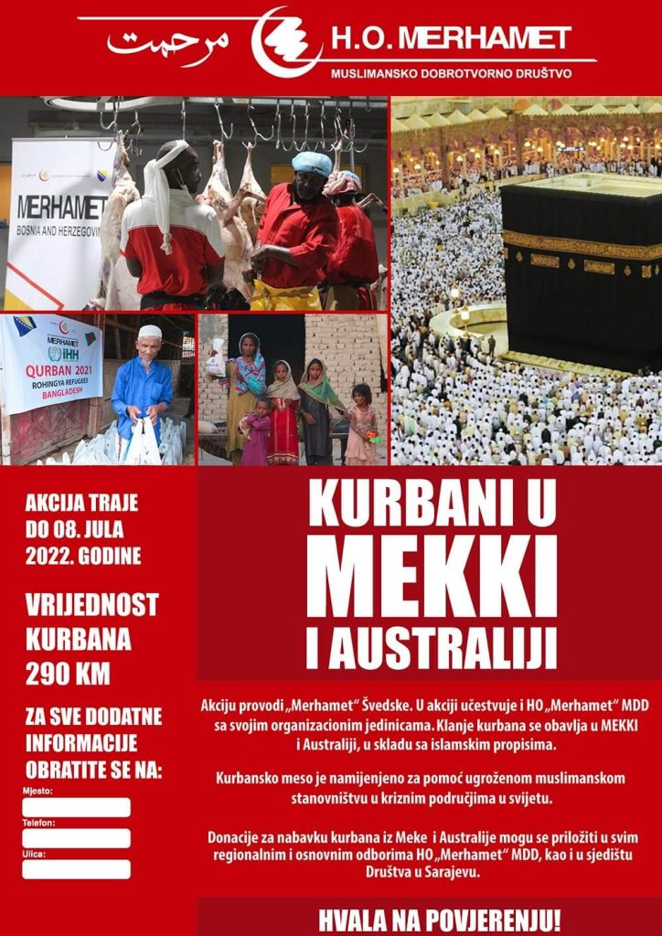 Švedske, a u akciji učestvuje i HO „Merhamet“ MDD sa svojim organizacionim jedinicama. Klanje kurbana se obavlja u Meki i Australiji, u skladu sa islamskim principima. Na ovaj način pomažemo ugroženo muslimansko stanovništvo u kriznim područjima u svijetu.