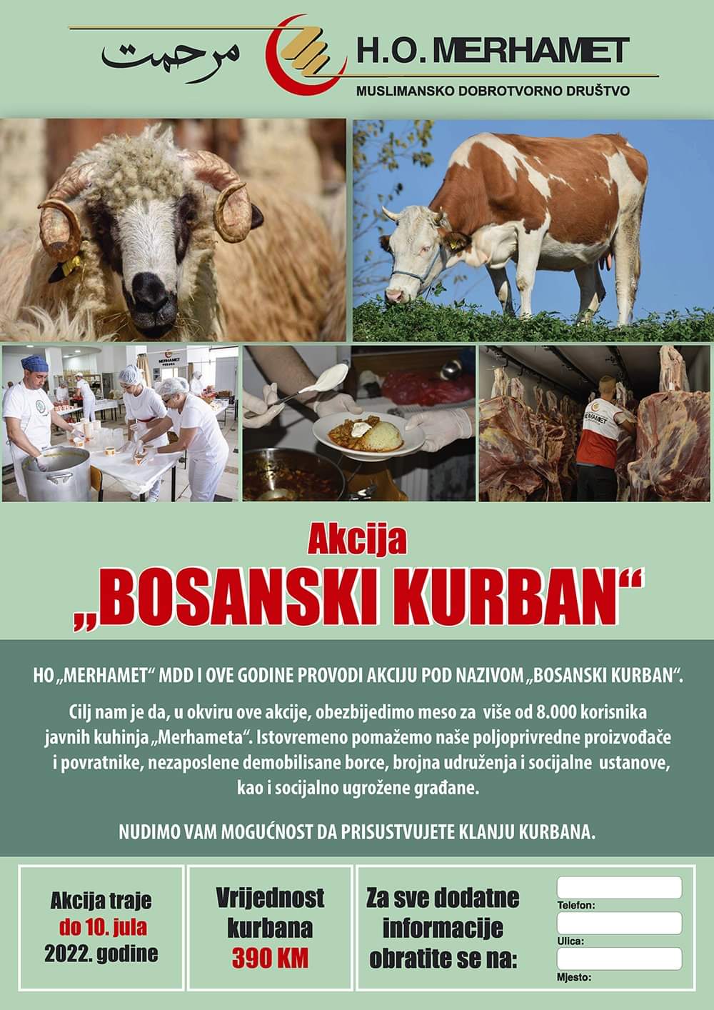 Muslimansko dobrotvorno društvo „Merhamet“ Regionalni odbor Zenica i ove godine provodi akciju „Kurban“. Cilj nam je da, u okviru ove akcije, obezbijedimo meso za korisnike javne kuhinje „Merhameta“. Istovremeno pomažemo naše poljoprivredne proizvođače i povratnike, nezaposlene demobilisane borce, brojna udruženja i socijalne ustanove, kao i socijalno ugrožene građane.