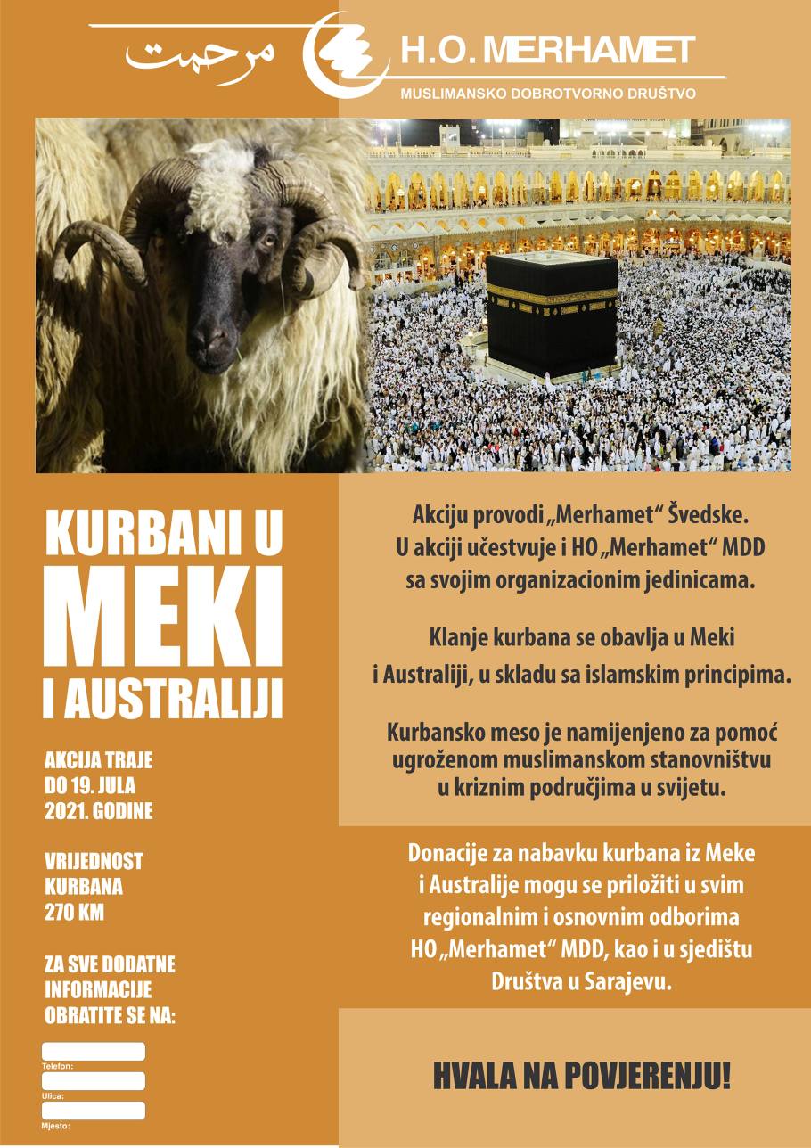 „Merhamet“ će primati i donacije za nabavku kurbana iz MEKE i AUSTRALIJE koju provodi „Merhamet“ Švedske, a u akciji učestvuje i HO „Merhamet“ MDD sa svojim organizacionim jedinicama.