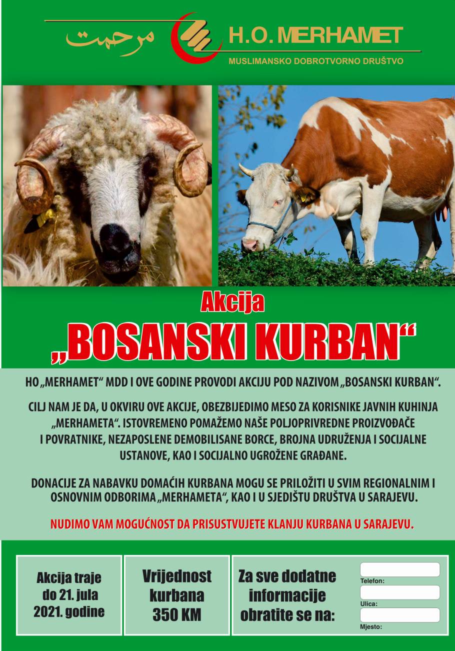 Merhamet Zenica: Akcija “Kurban 2021./1442.”- Muslimansko dobrotvorno društvo „Merhamet“ Regionalni odbor Zenica i ove godine provodi akciju „Kurban“. Cilj nam je da, u okviru ove akcije, obezbijedimo meso za korisnike javne kuhinje „Merhameta“. Istovremeno pomažemo naše poljoprivredne proizvođače i povratnike, nezaposlene demobilisane borce, brojna udruženja i socijalne ustanove, kao i socijalno ugrožene građane.