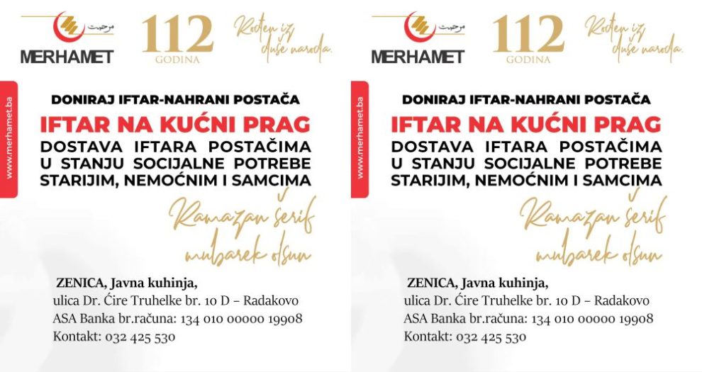 Merhamet Zenica i ove godine organizuje akciju “IFTAR” – Ovim putem želimo podsjetiti da “Merhamet” Regionalni odbor Zenica, tradicionalno, i ove godine organizuje akciju “IFTAR”, te da uz zajedničko učešće u ovoj akciji, doprinesemo da radost iftara osjete i oni koji su u stanju socijalne potrebe.