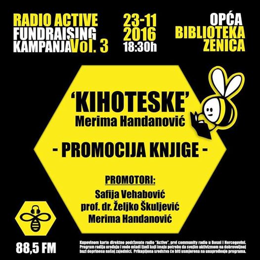 Merima Handanović: Pričajmo o Kihoteskama drugi put – srijeda 18.30 sati Opća biblioteka –  Nakon tri uspješne promocije ”Kihoteski” u Zenici, Kaknju i Sarajevu, Active radio Zenica, je odlučio da upriliči novu promociju knjige Merime Handanović, gdje će ljubitelji pisane riječi imati priliku da razgovaraju o utiscima nakon pročitane knjige, ali i nakon perioda otkako je knjiga objavljena i otkako je riječ zaživjela među čitateljima.
