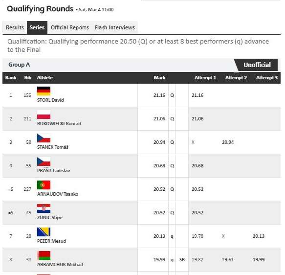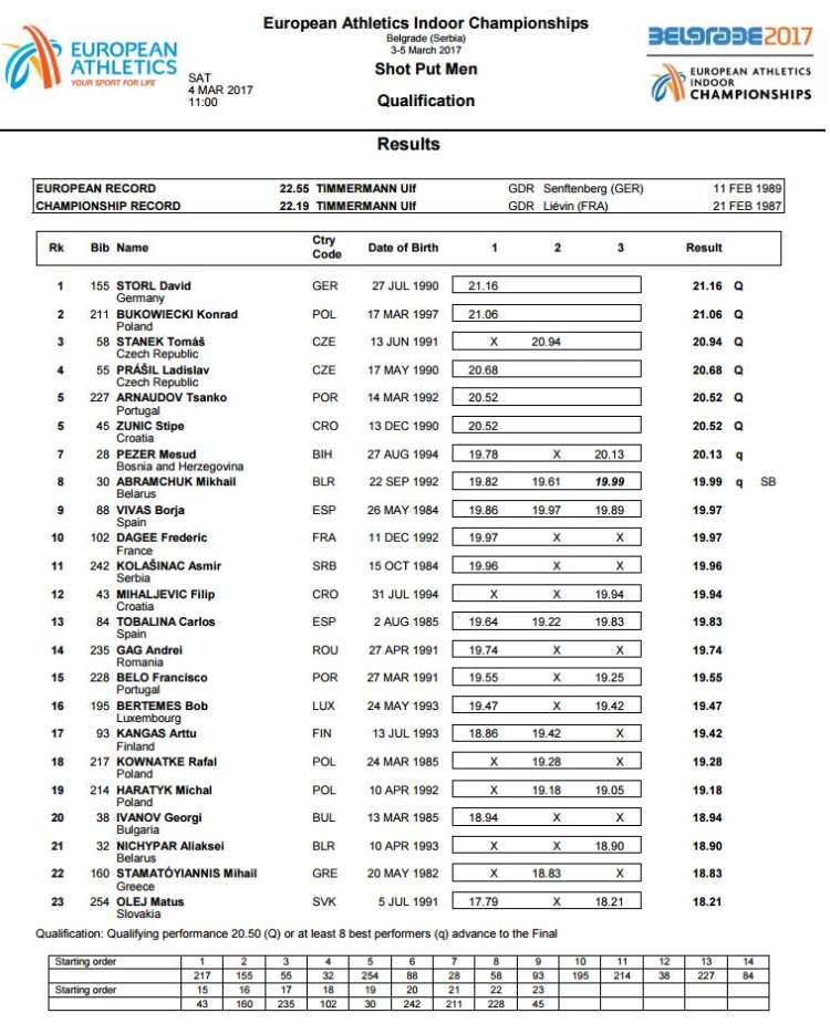 Mesud Pezer sa 20.13 se plasirao u finale EP u atletici – Daljinama od 20.13 u trećoj i 19.78 u prvoj seriji (uz prijestup u drugoj) Mesud Pezer, naš sugrađanin i jedan od tri bh. reprezentativca na Evropskom dvoranskom prvenstvu u atletici je uspio da se plasira u finalno takmičenje, koje će biti održano večeras. Pezer je imao sedmu daljinu od osam takmičara koji su prošli u finale.