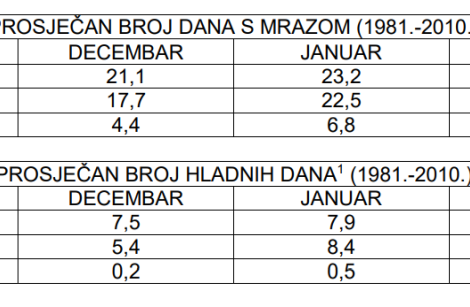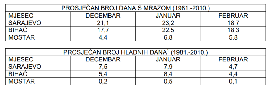 U poređenju sa istim razdobljem prošle godine, predstojeća zima trebala bi biti nešto hladnija u sjevernim i centralnim predjelima. Na jugu zemlje očekivane temperaturne prilike trebale bi biti približnih temperaturnih vrijednosti ili nešto hladnije. Iako se očekuje toplija zima nego što je uobičajeno, u prognoziranom razdoblju izvjesni su i prodori hladnih zračnih masa sa sjevera kontinenta, sa znatno nižim temperaturama zraka od prosječnih. Očekivani broj mraznih dana (minimalna temperatura zraka & 0,0 °C) u Bosni tokom zime (2020.-2021.) je do 60, a na području južne Hercegovine prognozira se do 15 mraznih dana.