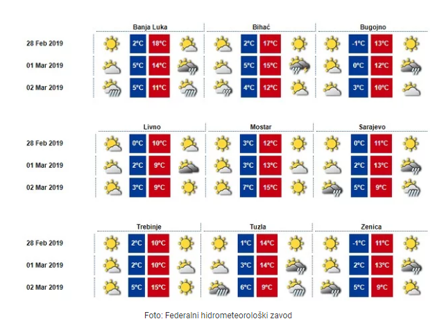 “Prema raspoloživim prognostičkim materijalima, u periodu od 4. do 11. marta prognozira se relativno stabilno vrijeme sa sunčanim intervalima na području Hercegovine. Više oblačnosti očekuje se u centralnim i istočnim područjima Bosne. U srijedu, 6. marta, u Bosni je moguća kiša, a u subotu, 9. marta, moguć je snijeg. Jutarnje temperature zraka kretat će se od 0 do 6 stepeni, na jugu zemlje do 10, najviše dnevne od 9 do 15 stepeni, na jugu zemlje do 17 stepeni celzija”, rekao je Dženan Zulum, meteorolog Federalnog hidrometeorološkog zavoda.