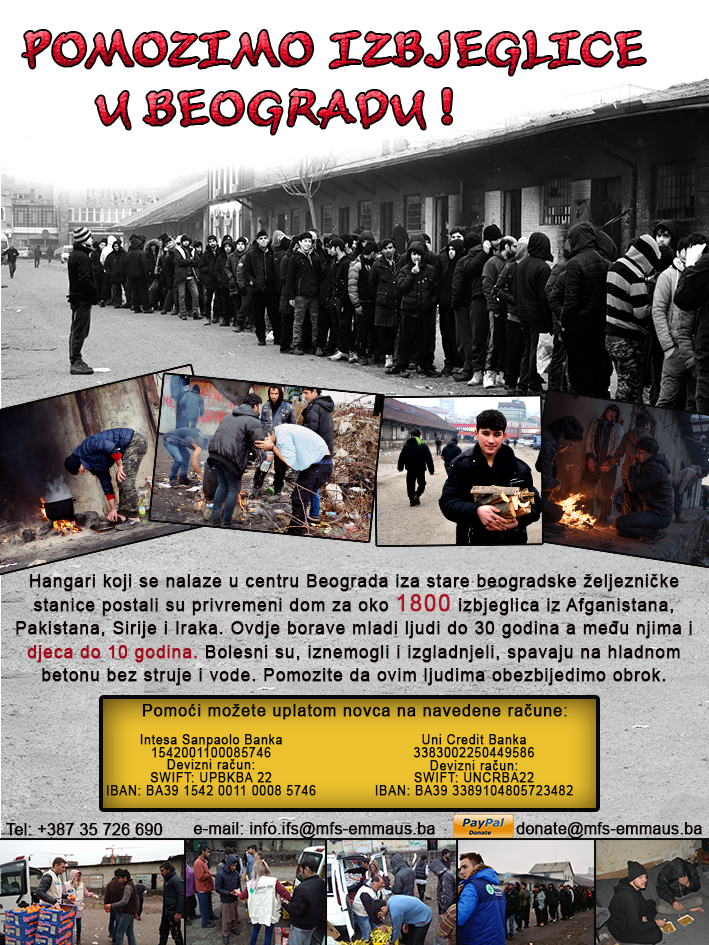Domaća, nevladina, humanitarna organizacija MFS-EMMAUS pokreće humanitarnu akciju «Pomozimo izbjeglice u Beogradu». Ovo je odlučeno nakon višesedmičnog boravka uposlenika organizacije MFS-EMMAUS u Beogradu, gdje su se uvjerili u katastrofalno stanje i ozbiljnost situacije.