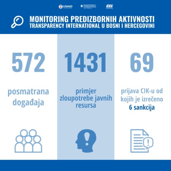 Posmatrači TI BiH zabilježili su brojne slučajeve kršenja Izbornog zakona, a zbog svega je upućeno 69 prijava Centralnoj izbornoj komisiji koje se u najvećoj mjeri odnose na zabranjeno oglašavanje van perioda izborne kampanje, ali i druge slučajeve zloupotreba javnih resursa za izbornu promociju.