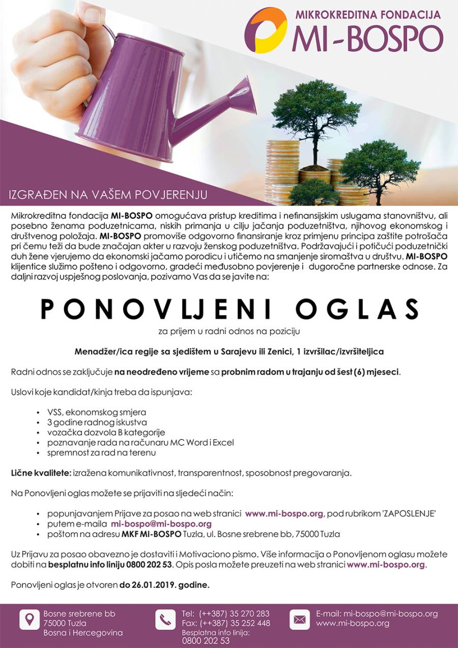 Mikrokreditna fondacije ‘MI-BOSPO’ Tuzla raspisuje ponovljeni oglas za prijem u radni odnos menadžera regije – Mikrokreditna fondacija MI-BOSPO omogućava pristup kreditima i nefinansijskim uslugama stanovništvu, ali posebno ženama poduzetnicama, niskih primanja u cilju jačanja poduzetništva, njihovog ekonomskog i društvenog položaja.