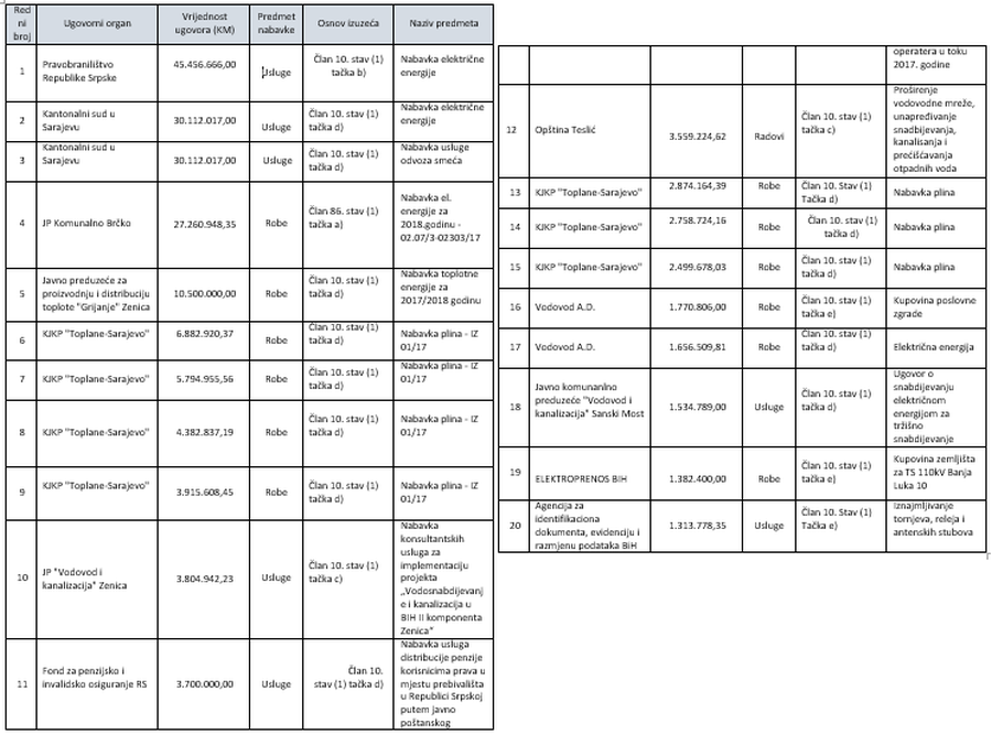 Mimo zakona u BiH potrošeno pola milijarde KM, na listi TOP 20 JP Grijanje i JP Vodovod i kanalizacija Zenica – Institucije, ustanove i javna preduzeća u BiH prošle godine su sklopile poslove vrijedne više od pola milijarde maraka izuzimajući se od primjene Zakona o javnim nabavkama BiH, otkriva portal CAPITAL. Koristeći članove 10. i 86. navedenog zakona, koji dopuštaju izuzeće, institucije, ustanove i preduzeća su najviše kupovali robe, za koje je potrošeno ukupno 392,6 miliona KM. Na usluge je dato 172,6 miliona, a na radove 13,5 miliona KM, pokazuju podaci Agencije za javne nabavke BiH, koji su u posjedu portala CAPITAL.