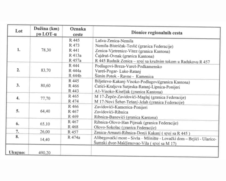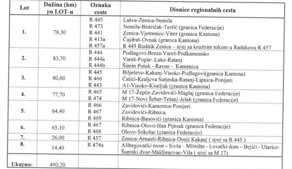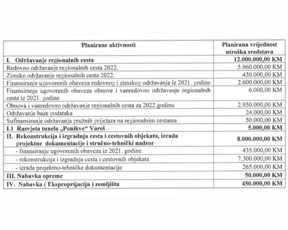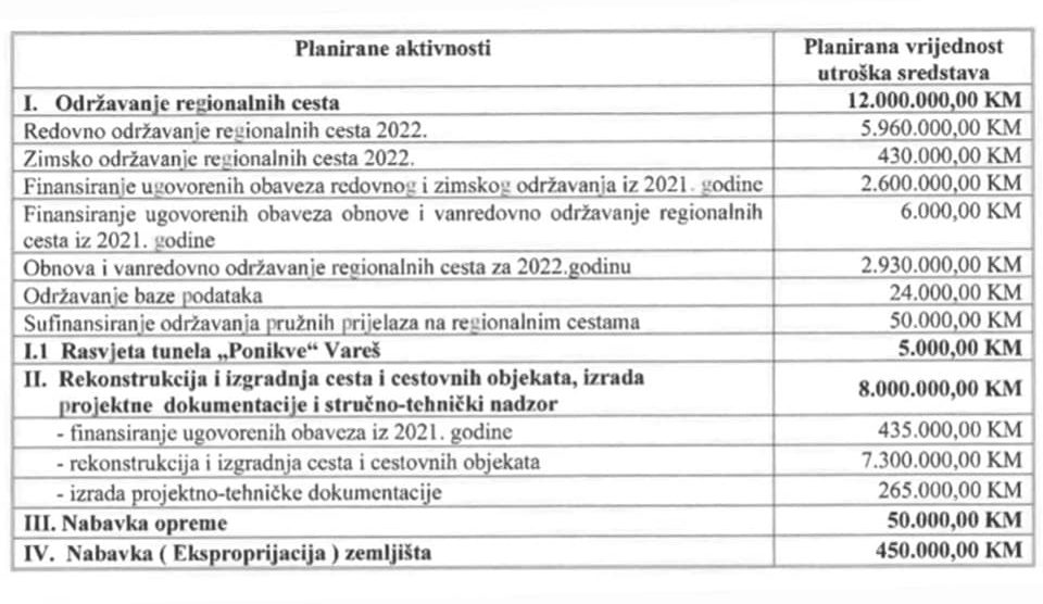 Vrijedi istaknuti da je za redovno održavanje regionalnih cesta predviđeno 5,96 miliona KM, za zimsko održavanje regionalnih cesta 430.000 KM, a za obnovu i vanredno održavanje regionalnih cesta 2,93 miliona KM.