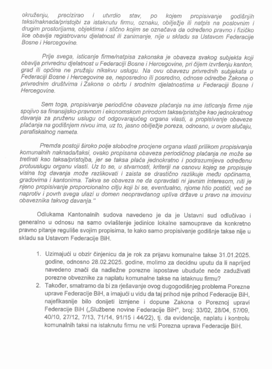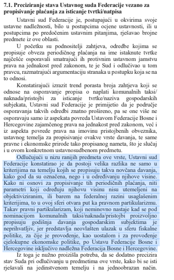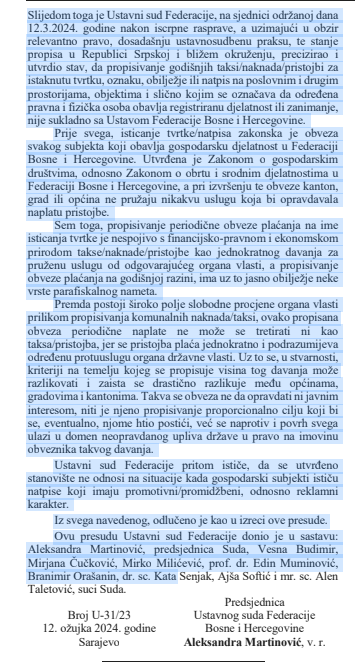 Pri tome, Ustavni sud FBiH jasno konstatuje da “propisivanje godišnjih taksi/naknada/pristojbi za istaknutu firmu/tvrtku, znaku, obilježje ili natpis na poslovnim i drugim prostorijama, objektima i slično kojim se označava da određena pravna i fizička osoba obavlja registriranu djelatnost ili zanimanje, nije u skladu sa Ustavom Federacije Bosne i Hercegovine”.