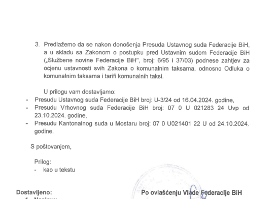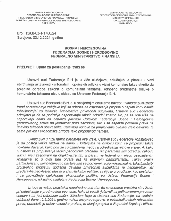 Naime, Porezna uprava FBiH 3.12.2024. od Ministarstva finansija FBiH, kao svog nadležnog organa, traži upute kako da postupaju s obzirom na gore navedene Presude Ustavnog suda FBiH.