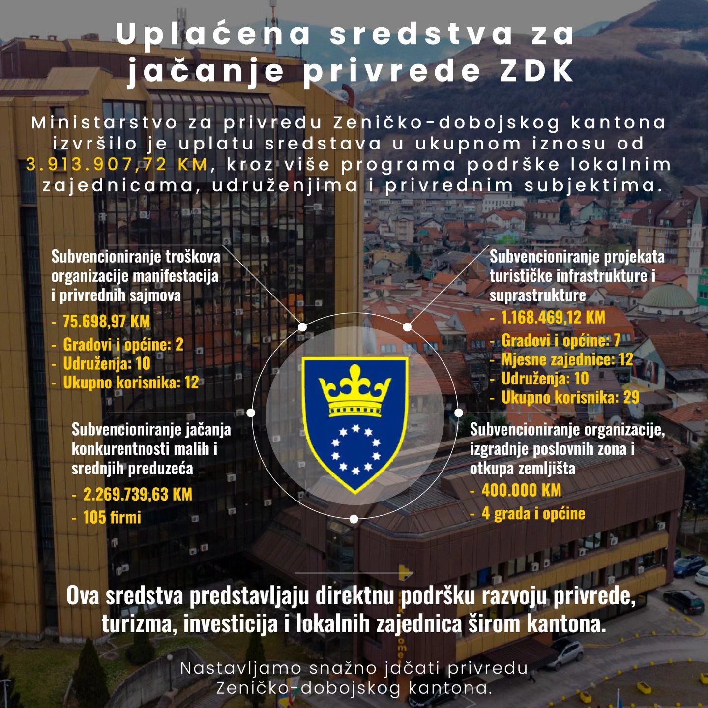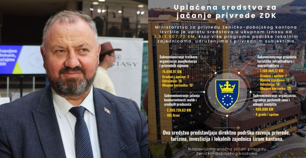 Samir Šibonjić, ministar privrede Zeničko-dobojski kanton, saopćio je da je Ministarstvo za privredu Zeničko-dobojskog kantona izvršilo uplatu sredstava u ukupnom iznosu od 3.913.907,72 KM kroz više programa podrške lokalnim zajednicama, udruženjima i privrednim subjektima na području kantona.