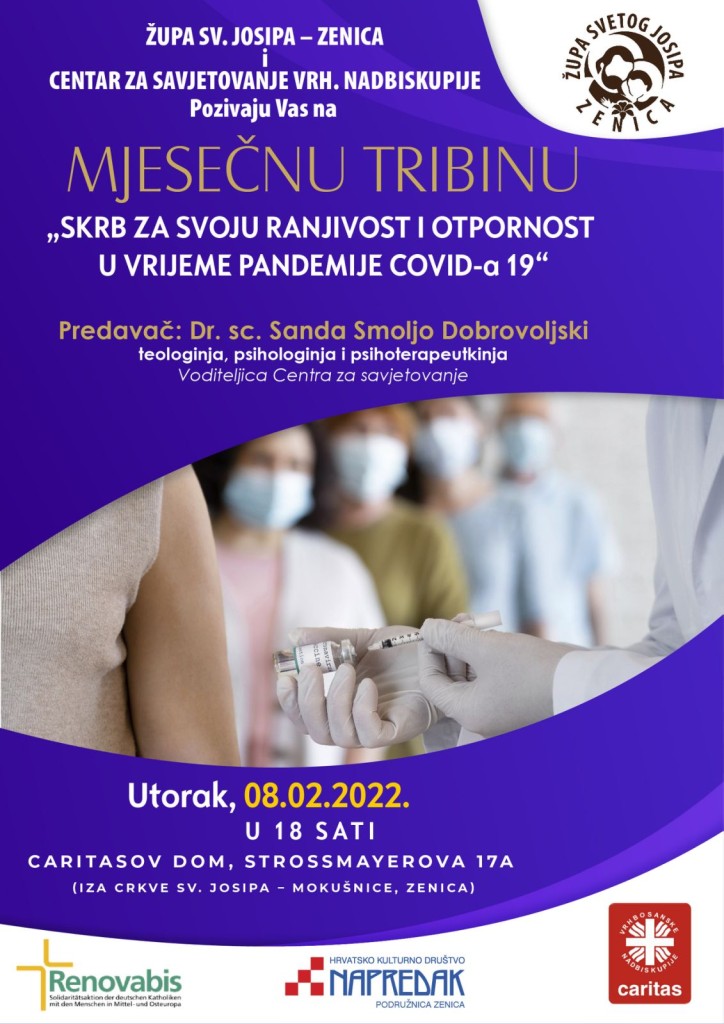 Prva mjesečna tribina bit će u utorak, 8. veljače 2022. u 18 sati na temu „Skrb za svoju ranjivost i otpornost u vrijeme pandemije Covid-a 19“ koju će održati voditeljica Centra za savjetovanje vrhbosanske nadbiskupije dr. Sanda Smoljo Dobrovoljski, teologinja, psihologinja i psihoterapeutkinja.