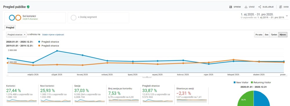 Čak za trećinu više (33,87%) pregleda stranice ZENICABLOG u 2020. u odnosu na 2019. godinu zabilježio je Google Analytics. To znači da ste našu stranicu u prošloj godini otvorili 12.815.125 puta (u 2019. – 9.572.504).