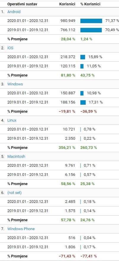 Zanimljivo je da našem sajtu pristupaju najviše korisnici Android operativnog sistema, potom IOS (Apple), kod ta dva operativna sistema je zabilježen rast, a pad je zabilježen kod Windows OS (3. po korištenju), a slijede Linux, Macintosh, Windows Phone…